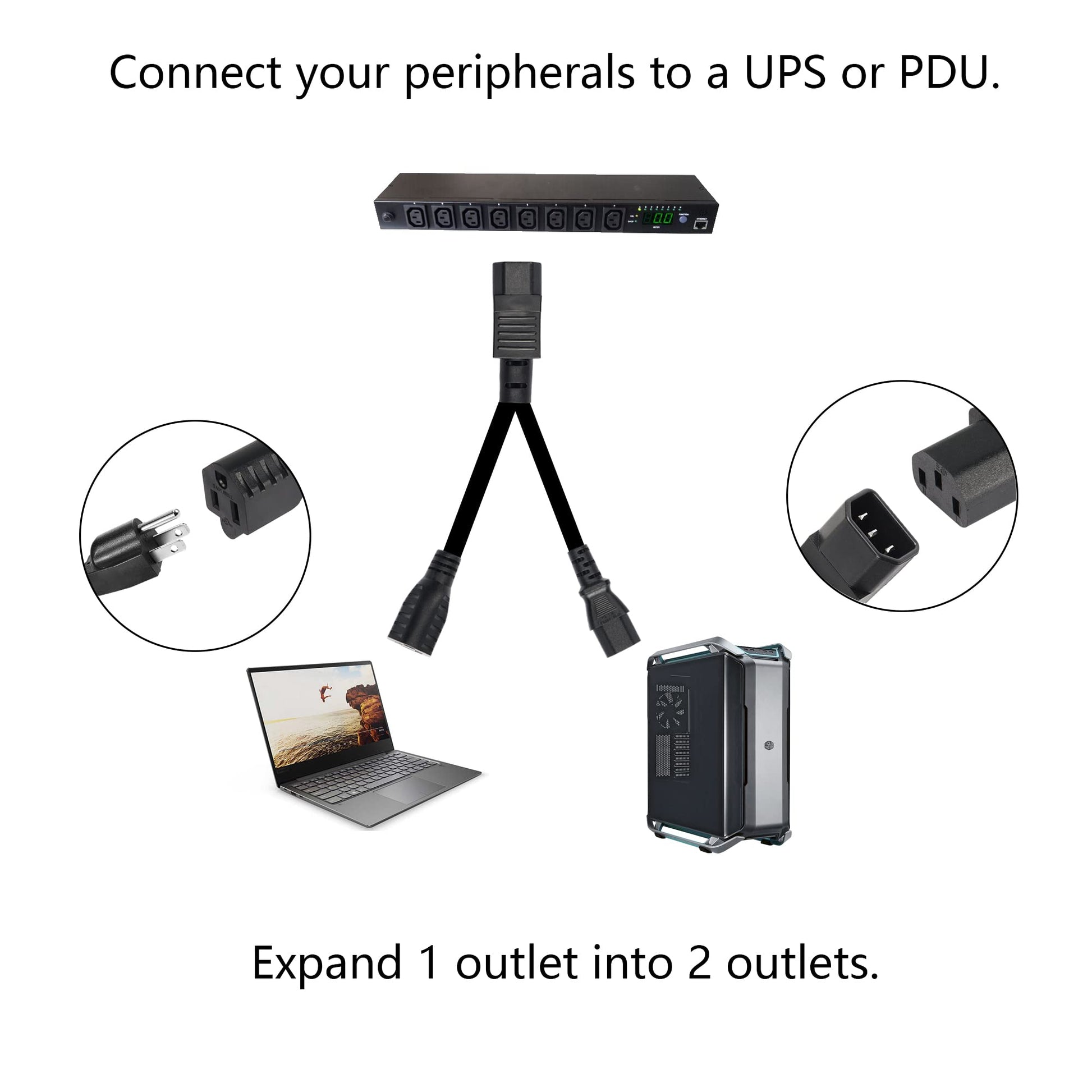 - Use c14 splitter cable to power 2 devices at the same time, such as powering your laptop and an extra monitor through a single plug.