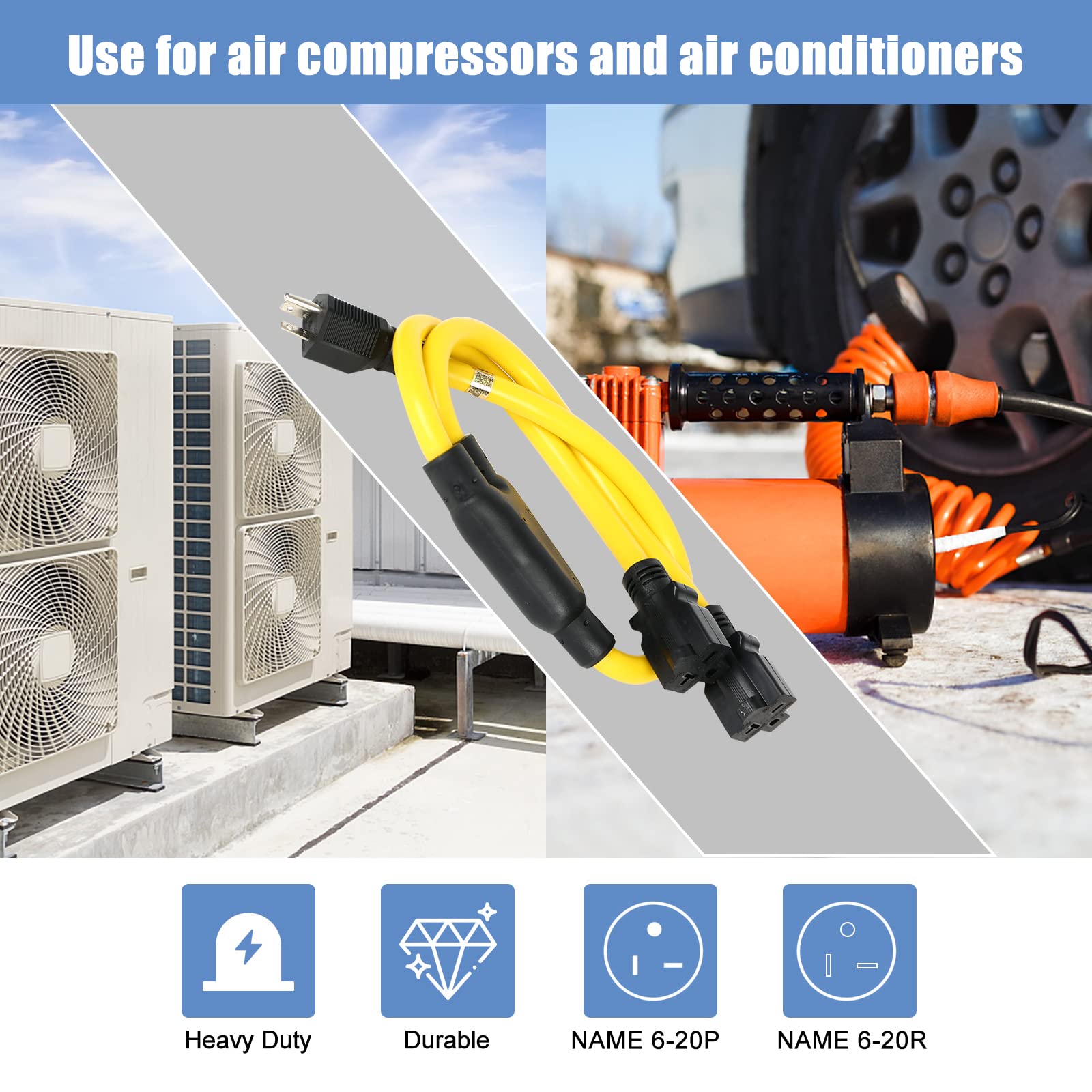NEMA 6-20 Splitter, 6-20P to (2) 6-20R NEMA 6-20 Extension Cord 6-20P to 6-20R (T Blade Female Also for 6-15R Adapter)