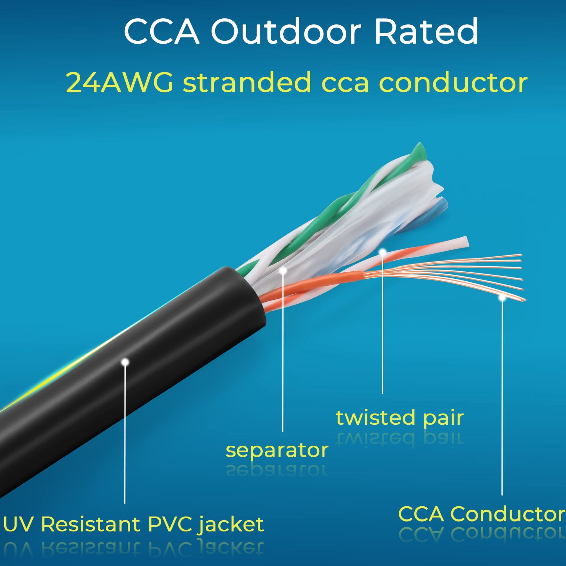 - 【Universal Connectivity】cat6 ethernet cable 100 ft is universal connectivity to various device, such as computers, routers, and wifi device and so on. Cat 6 outdoor cable didn’t support POE device, cause it is made of 24 awg CCA (Copper Clap Aluminum) conductor.
